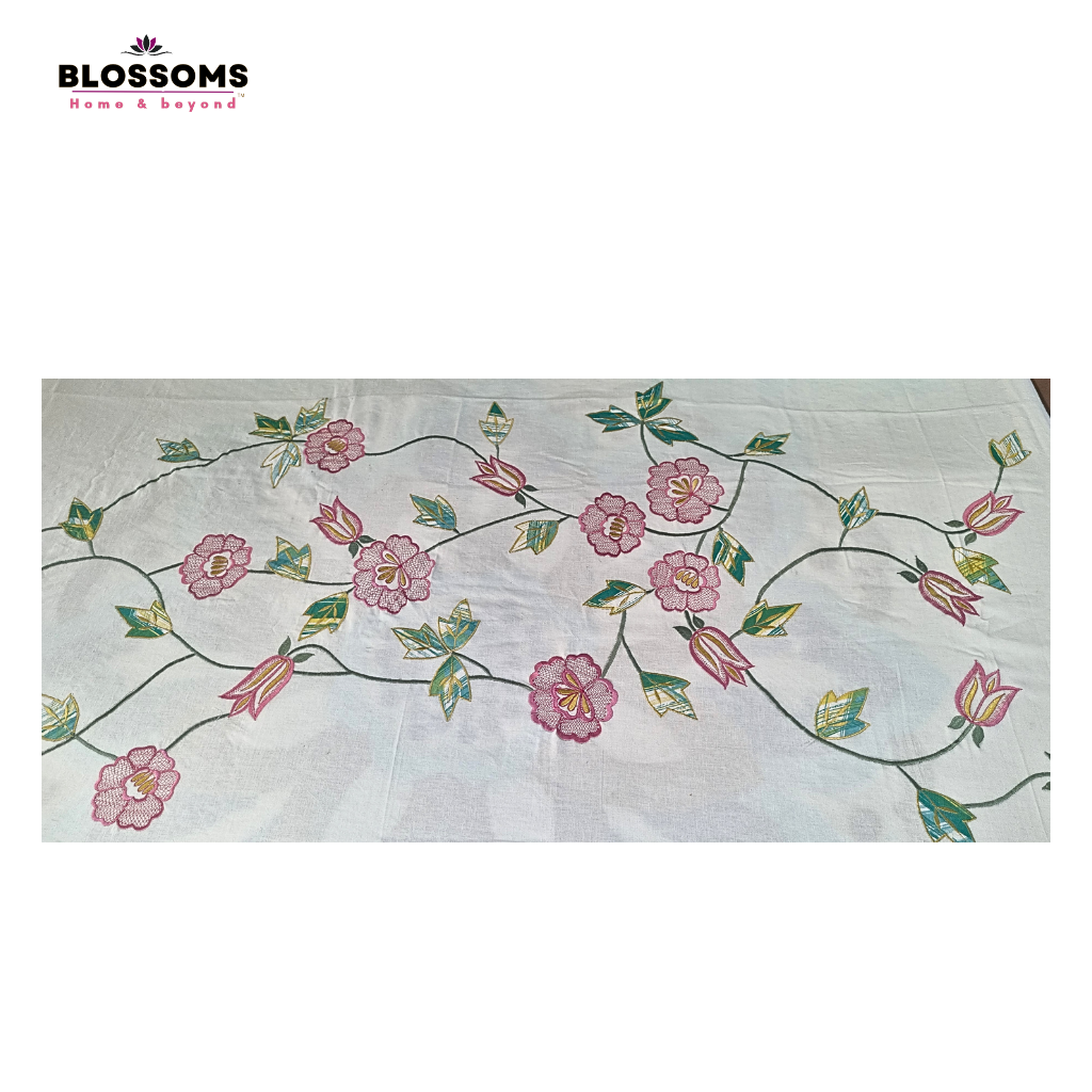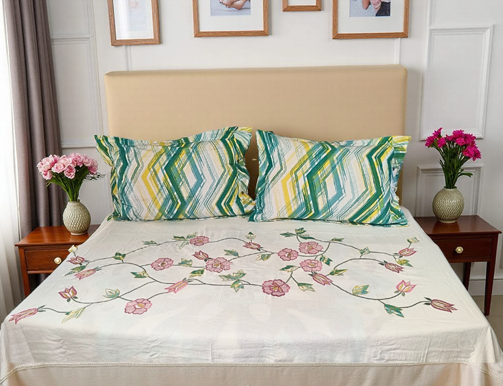 Blossoms embroidered bedsheet with 2 engineered printed pillows . Pure cotton.Subtle off-white color.