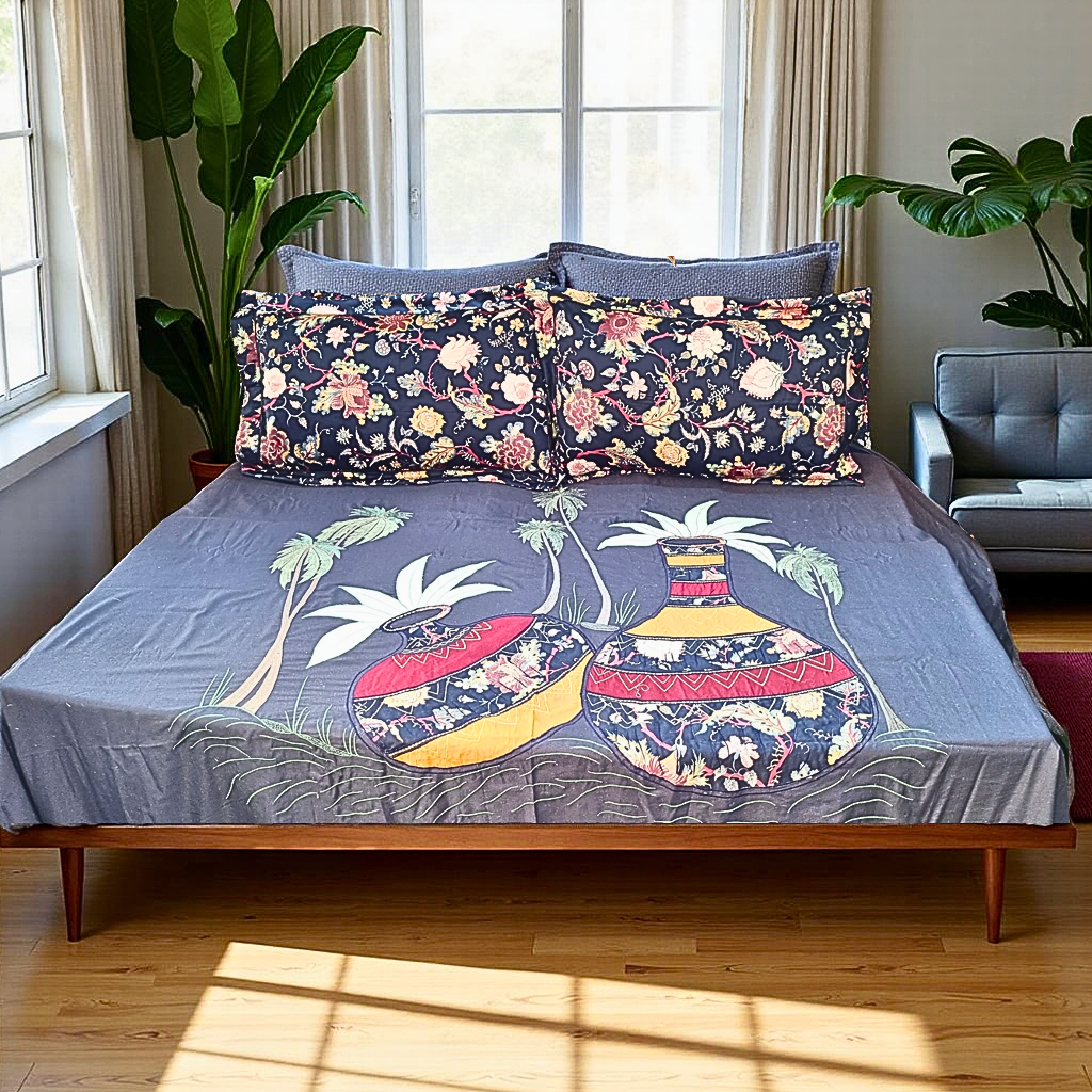 Blossoms Embroidered patch work kalash design on grey bedsheet with highly detailed design and 2 printed pillow covers . Pure cotton fabric.