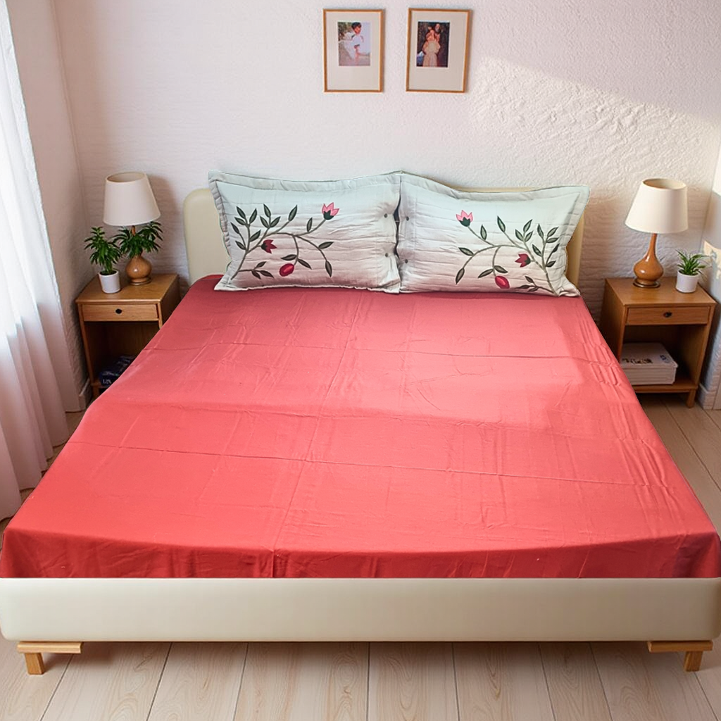 Blossoms peach bedsheet with 2 quilted embroided pillowcovers. Pure cotton , big size bedsheet.