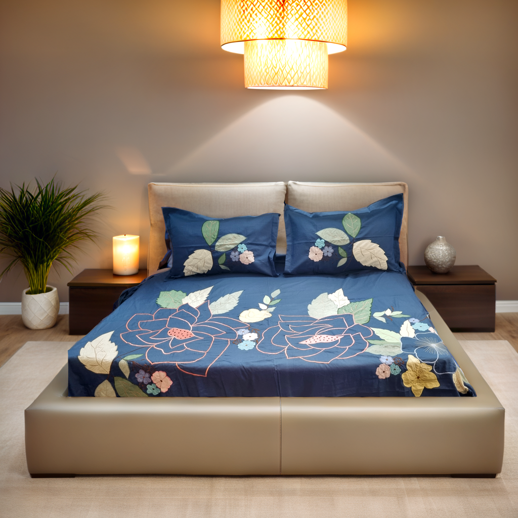 Designer embroided bedcover with patchwork and embroidery on bedcover and pillows.